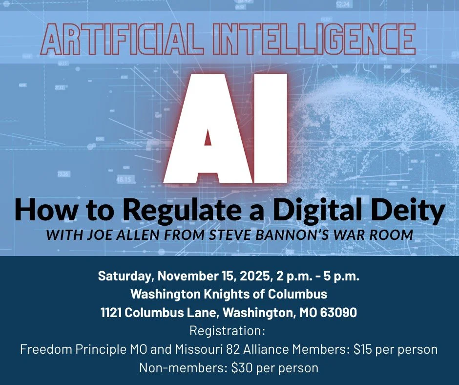 Joe Allen, the incisive transhumanism expert from Steve Bannon’s War Room and author of Dark Aeon: Transhumanism and the War against Humanity, takes the stage to unpack these stakes in his keynote, “How to Regulate a Digital Deity,” at the AI Summit on November 15, 2025, from 2:00 pm to 5:00 pm at the Washington Knights of Columbus, 1121 Columbus Lane, Washington, MO 63090.
