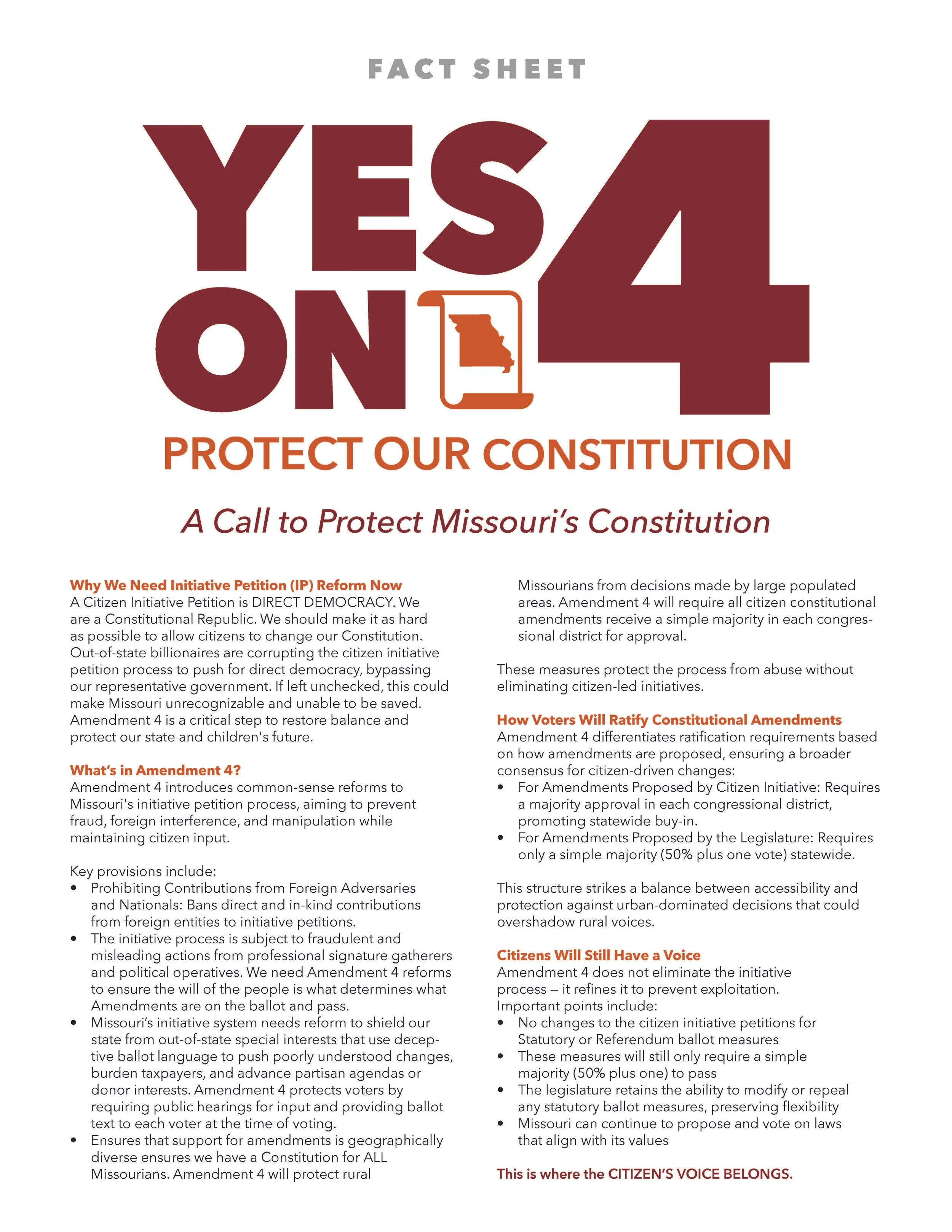 Amendment 4 introduces common-sense reforms to Missouri's initiative petition process, aiming to prevent fraud, foreign interference, and manipulation while maintaining citizen input.